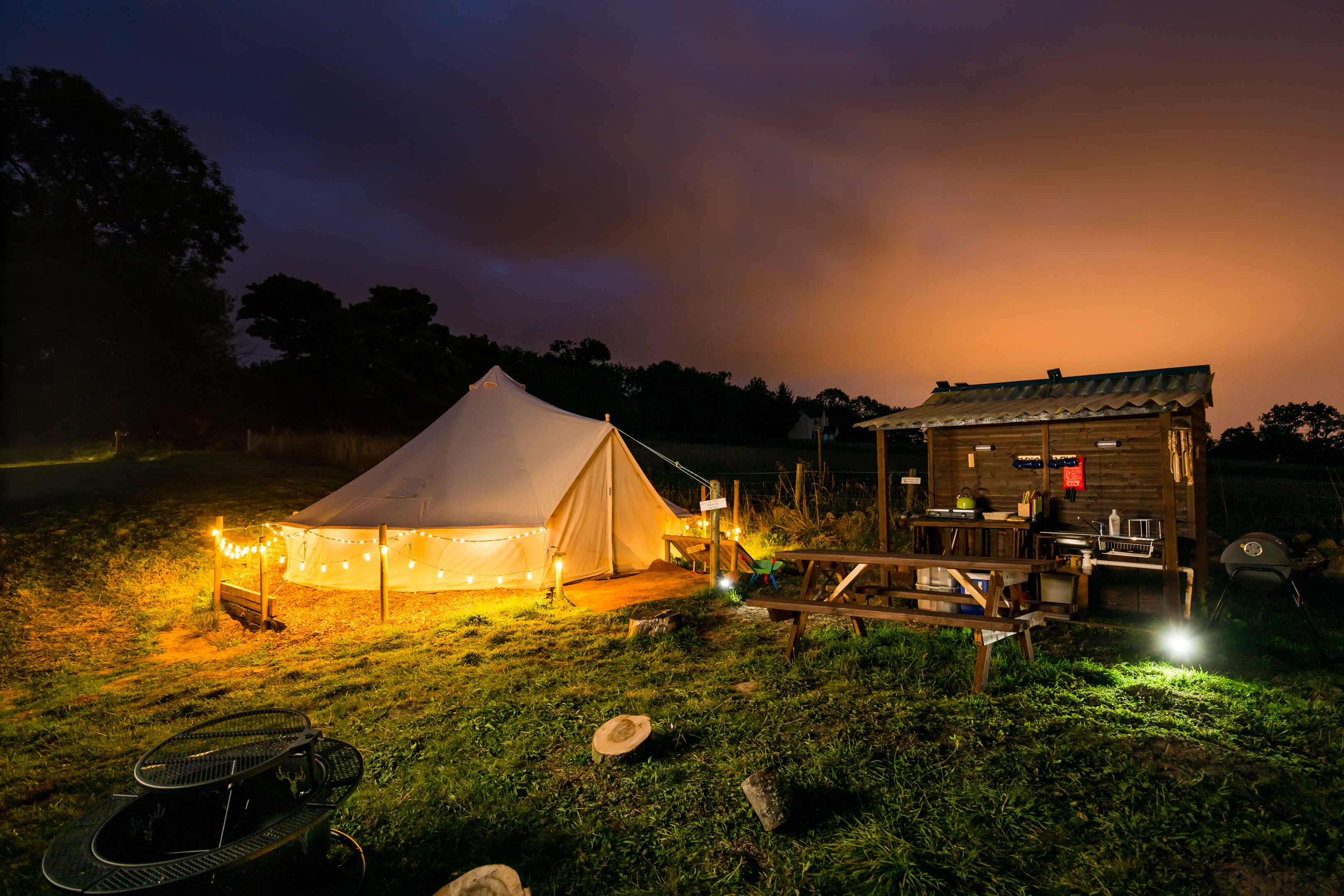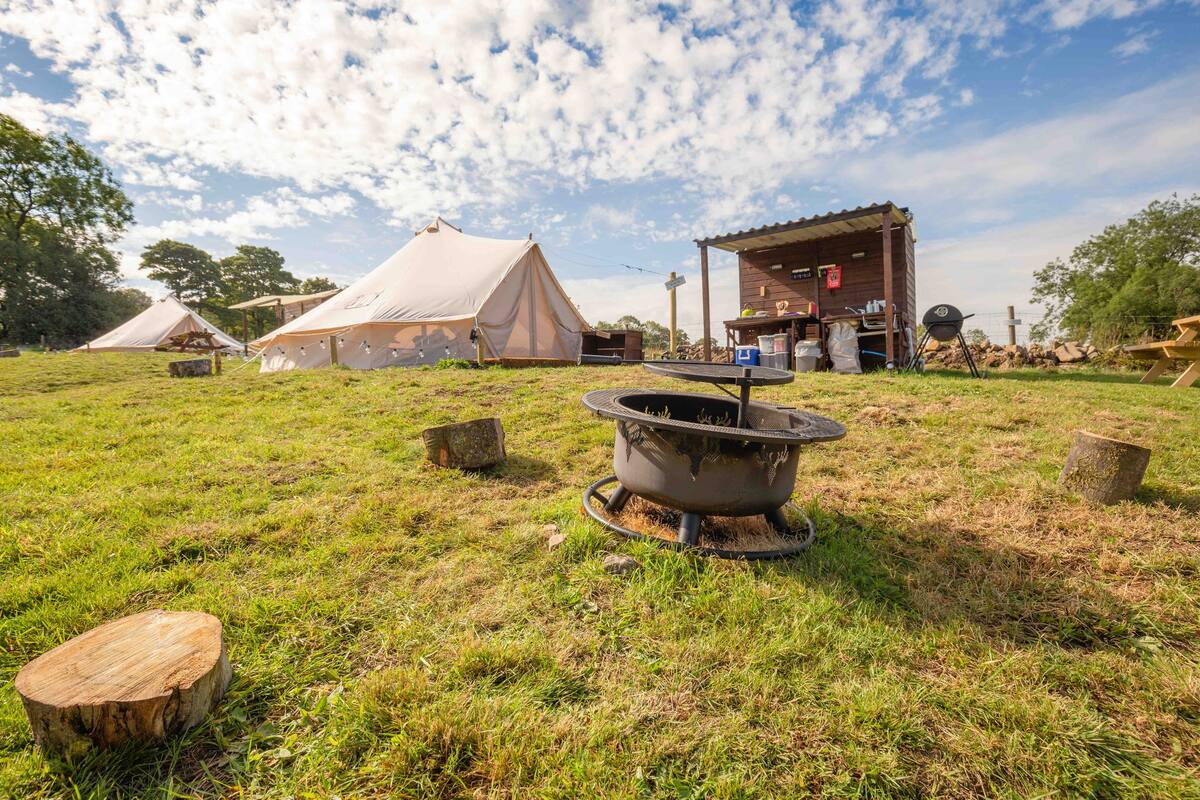 Outside you'll find a BBQ, fire pit with a log circle and picnic table for each tent - the perfect set-up for sunny daytime picnics or toasted marshmallows under the stars!